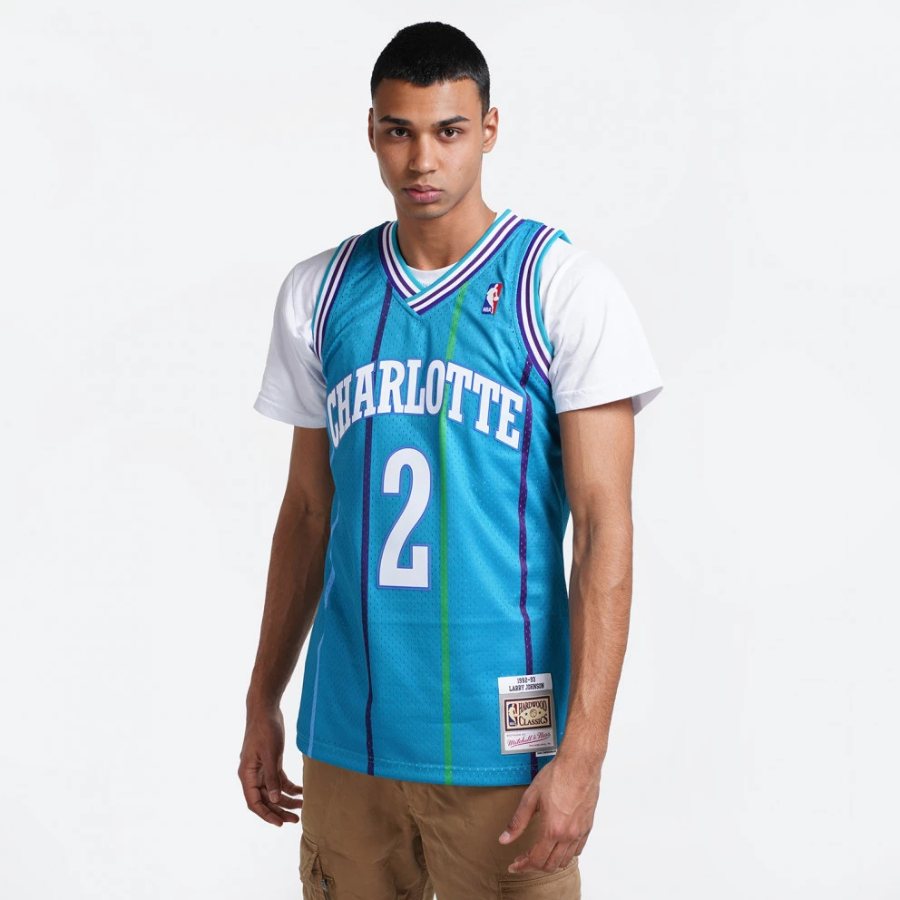 Φανέλα NBA με το όνομα του Larry Jphnson, παίκτης ο οποίος αποτελεί μέρος της ιστορίας της ομάδας ΝΒΑ των Charlotte Hornets. Αυτό το Swingman Jersey αναπαριστά την εμφάνιση της orignal ομάδας από τη σεζόν 1992-93. Στο μπροστινό μέρος ο αριθμός 2 και το λογότυπο Charlotte Hornets. Στο πίσω μέρος το όνομα και ο αριθμός του παίκτη.